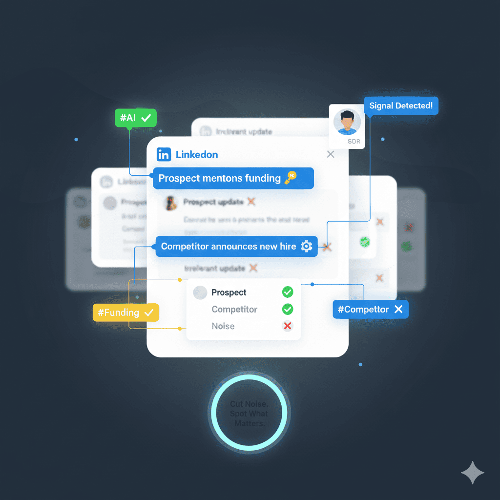 AI scans LinkedIn for keywords, competitor activity, and prospect posts. Cut through the noise and spot only what matters.